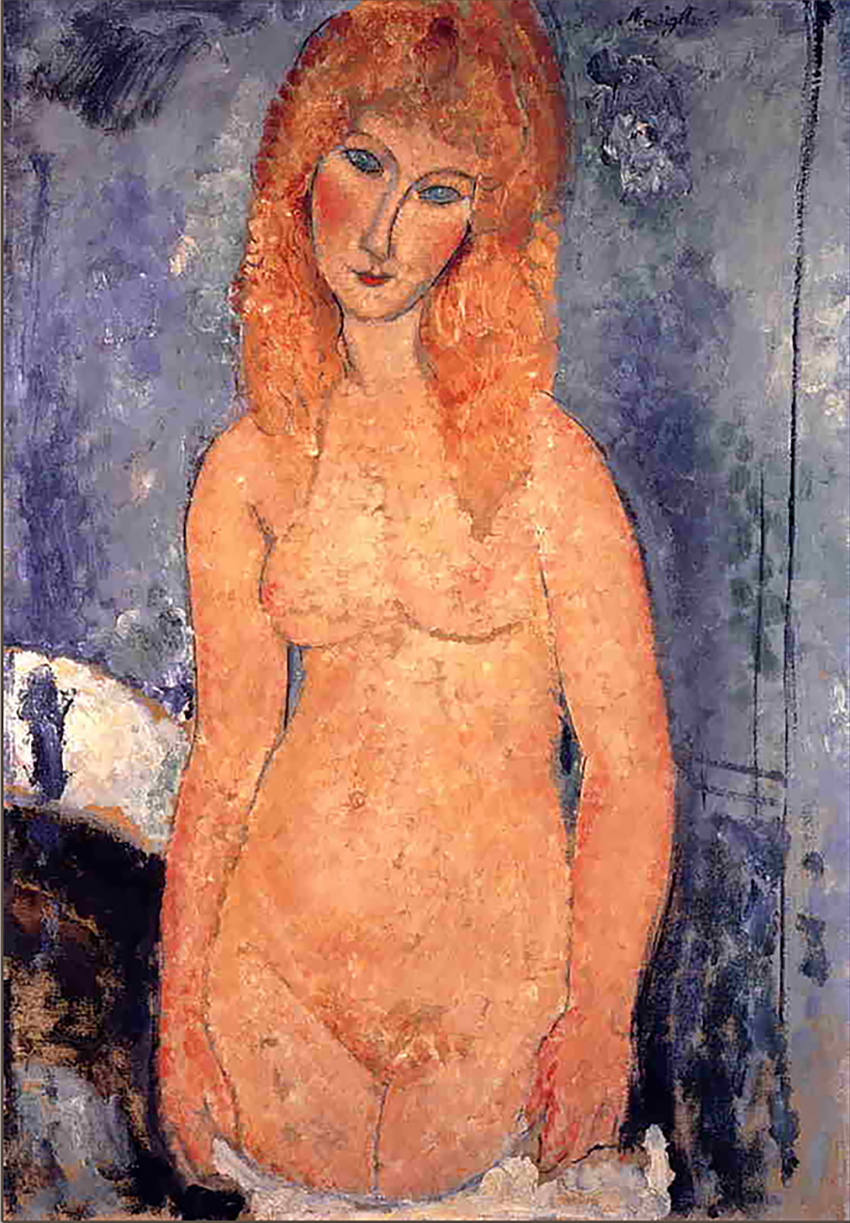 Αρχικά συγκρίνει τις ζωηρές μορφές που δημιούργησε το πινέλο του Μοντιλιάνι με τις άψυχες φιγούρες των ακαδημαϊκών ζωγράφων που προηγήθηκαν : «τα κρύα, σαν γυαλόχαρτο γυμνά των ακαδημιών τέχνης… σώματα από φουσκωτό λάστιχο, στήθη στοιβαγμένα σαν πολυώροφες τούρτες , γλουτοί σαν τρεμάμενη ζελατίνα ». Αντίθετα, στα έργα του Μοντιλιάνι, «μια ανάσα εκπορεύεται από τα γυμνά του , η ίδια η ανάσα της ζωής… Πού αλλού ενσαρκώνεται καλύτερα ο παλμός του ζώντος;» Και αποτίνοντας φόρο τιμής στο Γυμνό Ξανθό, μόλις που μπορεί να συγκρατήσει τον ενθουσιασμό του. Οι «πιο απολαυστικοί τόνοι της σάρκας της αναμειγνύονται, ζυμώνονται με μια χαριτωμένη ελαφρότητα, δέρνονται με ασημένιο και ροζ , τρίβονται με κεχριμπάρι, αφρατευουν με ξανθαδα , αυτή η θριαμβευτική φρεσκάδα που το εκλεπτυσμένο, αμβλυμμένο φως ενός πρωινού του Απριλίου χαϊδεύει περισσότερο παρά σμιλευει . Ανάμεσα στο φως και το δέρμα, υπάρχει αυτό το άυλο βελούδινο ένδυμα, αυτό το ‘παγωμένο’ διάφανο άνθος, όπου όμως ο φωτισμός παίζει με όλη τη λαμπρότητα του: όλα αυτά αναμεμιγμένα, λιωμένα, λιγότερο ζωγραφισμένα παρά ψεκασμένα στον καμβά.»